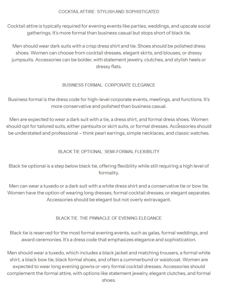 Any of the above styles is more than acceptable for the evening, please don’t feel you need to buy clothes specifically for this event.
